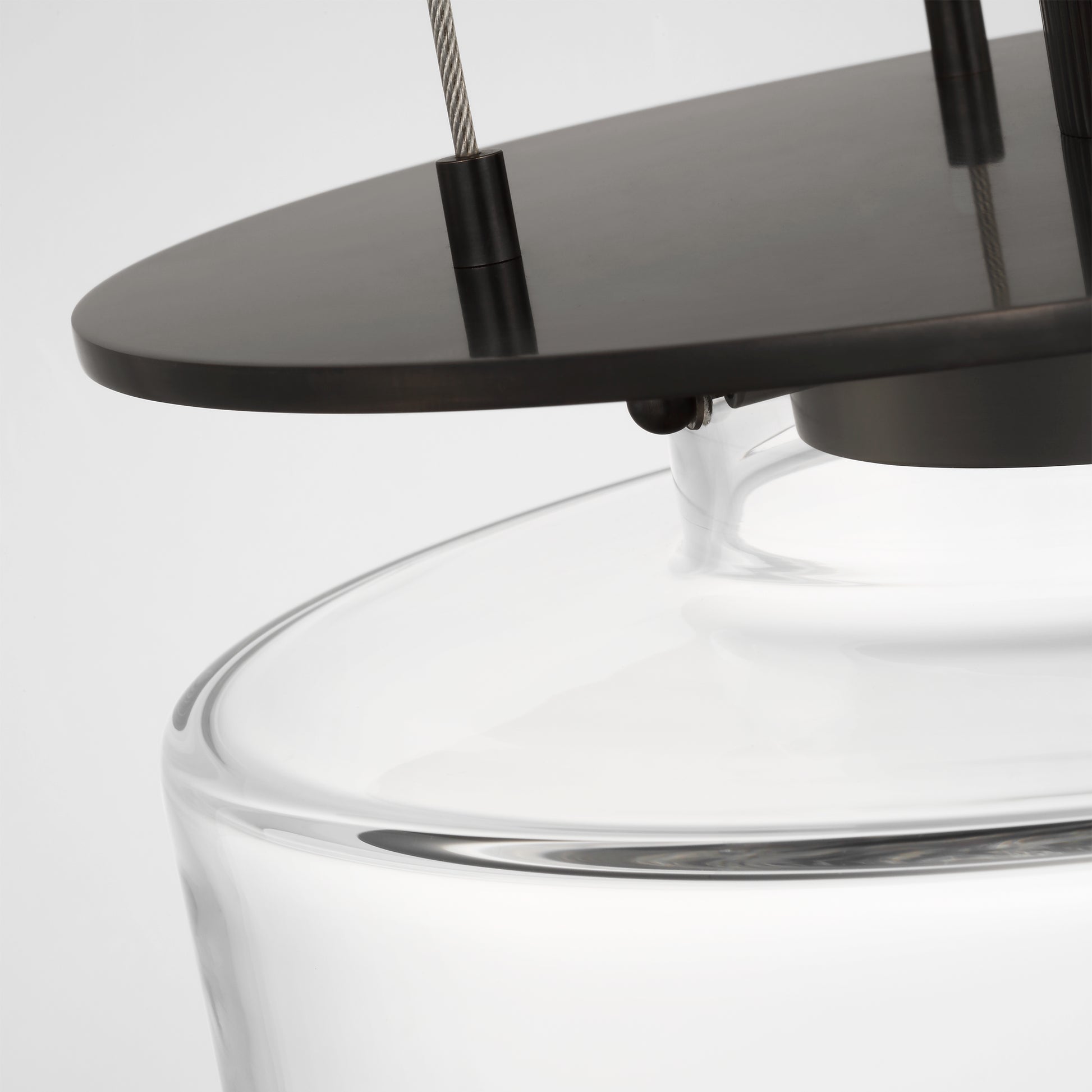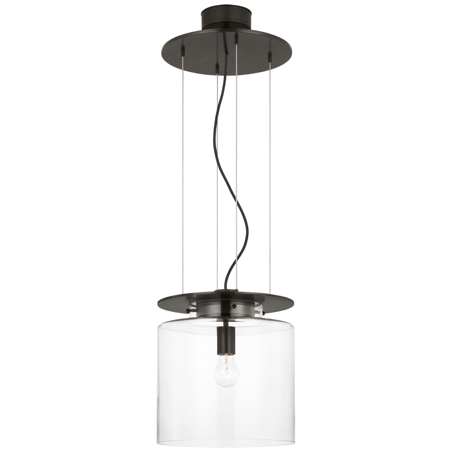 Exquisitely designed by Ray Booth for Visual Comfort, the Elias 13″ Floating Pendant emanates sculptural elegance and refined craftsmanship. Its clear cylindrical glass shade is subtly supported by slim, cable mountings and a decorative metal disc, creating the illusion of a light source that floats gracefully beneath the ceiling.