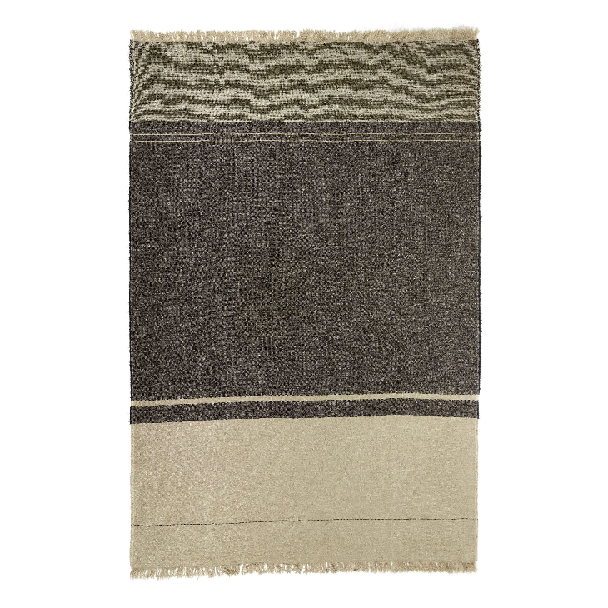 The central section of this throw is a black/flax plain weave construction, while the top end is a black/flax small stripe and the bottom end is solid flax with a single black stripe. Both ends are finished with a flax fringe.