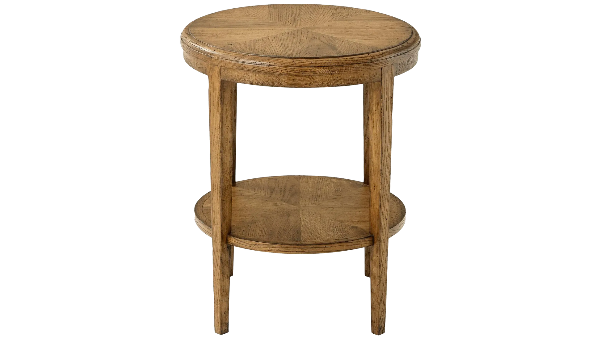 This endearing two-tiered round side table seen in our Dawn finish displays its uniquely arranged radial design on its oak parquetry top and shelf. Joined by tapered oak leg.